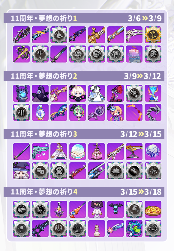「11周年・夢想の祈り」にて、以下の内容が排出されます!